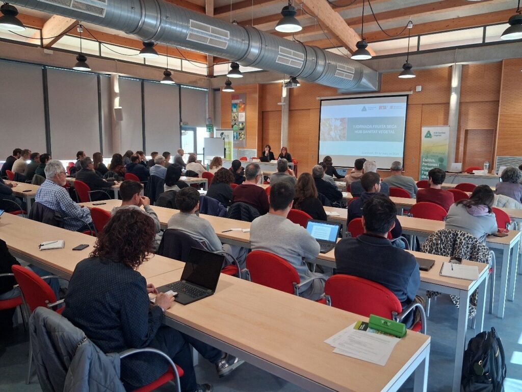 El passat 24 de març de 2026 es va celebrar al Centre IRTA Mas Bové la I Jornada de Fruita Seca del HUB de Sanitat Vegetal, una trobada creada amb l’objectiu de donar resposta als principals reptes fitosanitaris identificats pel sector. Més de 60 persones hi van participar presencialment —productors, tècnics assessors i investigadors—, fet que posa de manifest la necessitat i l’interès per disposar d’un espai de treball compartit en l’àmbit de la sanitat vegetal.