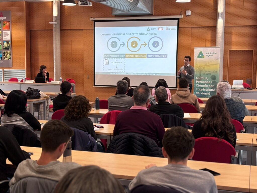 La jornada es va iniciar amb les intervencions de l’Anna Lekunberri, cap de Sanitat Vegetal del DARPA, i Neus Teixidó, coordinadora del HUB de Sanitat Vegetal, que van oferir una radiografia de l’estat actual de la sanitat vegetal en fruita seca i van presentar l’estructura i el funcionament del HUB. Tot seguit, l’Íñigo Vargas, coordinador tècnic de fruita seca del HUB, va exposar una visió global dels reptes prioritaris del sector. Al llarg del matí, la Laura Torguet, especialista en malalties de l’ametller del programa de fructicultura de l’IRTA, va presentar les claus per al maneig integrat de l’ametller; la Sara Rodrigo, tècnica de sanitat vegetal de la JCCM va analitzar l’impacte creixent dels bernats en pistatxer; la Georgina Alins, cap del programa de fructicultura de l’IRTA va destacar el paper de la biodiversitat en la regulació natural de les plagues; i la Dolors Bosch, investigadora del programa de protecció vegetal sostenible de l’IRTA va compartir resultats recents sobre Cydia pomonella i Apomyelois ceratoniae en noguer. La sessió va concloure amb la xerrada de Roberto Masturzi, investigador de la Universitat de Tucsia (Itàlia), que va presentar noves estratègies per al control del badoc (Phytoptus avellanae) en avellaner.