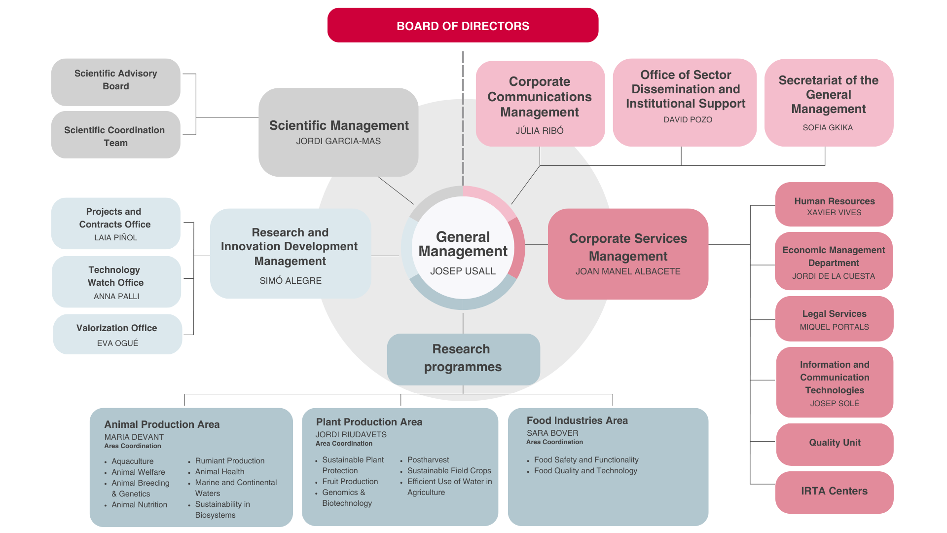 IRTA is a public company owned by the Government of Catalonia, regulated by Law 4/2009 of 15 April of the Parliament (BOE of 23 April 2009), which brings its activities into line with private law. It is organised under a board of directors, chaired by the minister of the Department of Agriculture, Livestock, Fisheries and Food of the Government of Catalonia, several departments under the command of the director general, and a list of research programmes.
