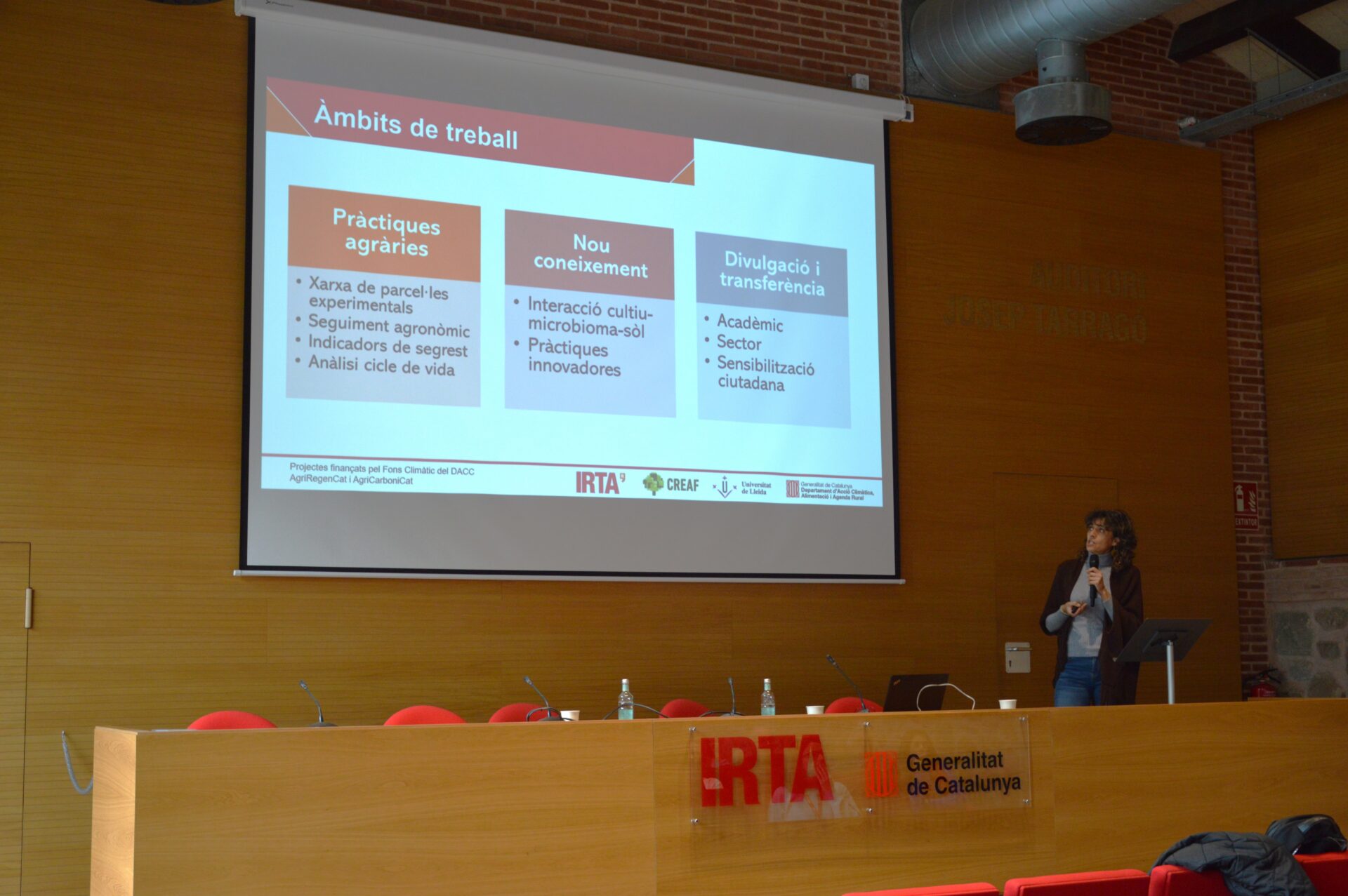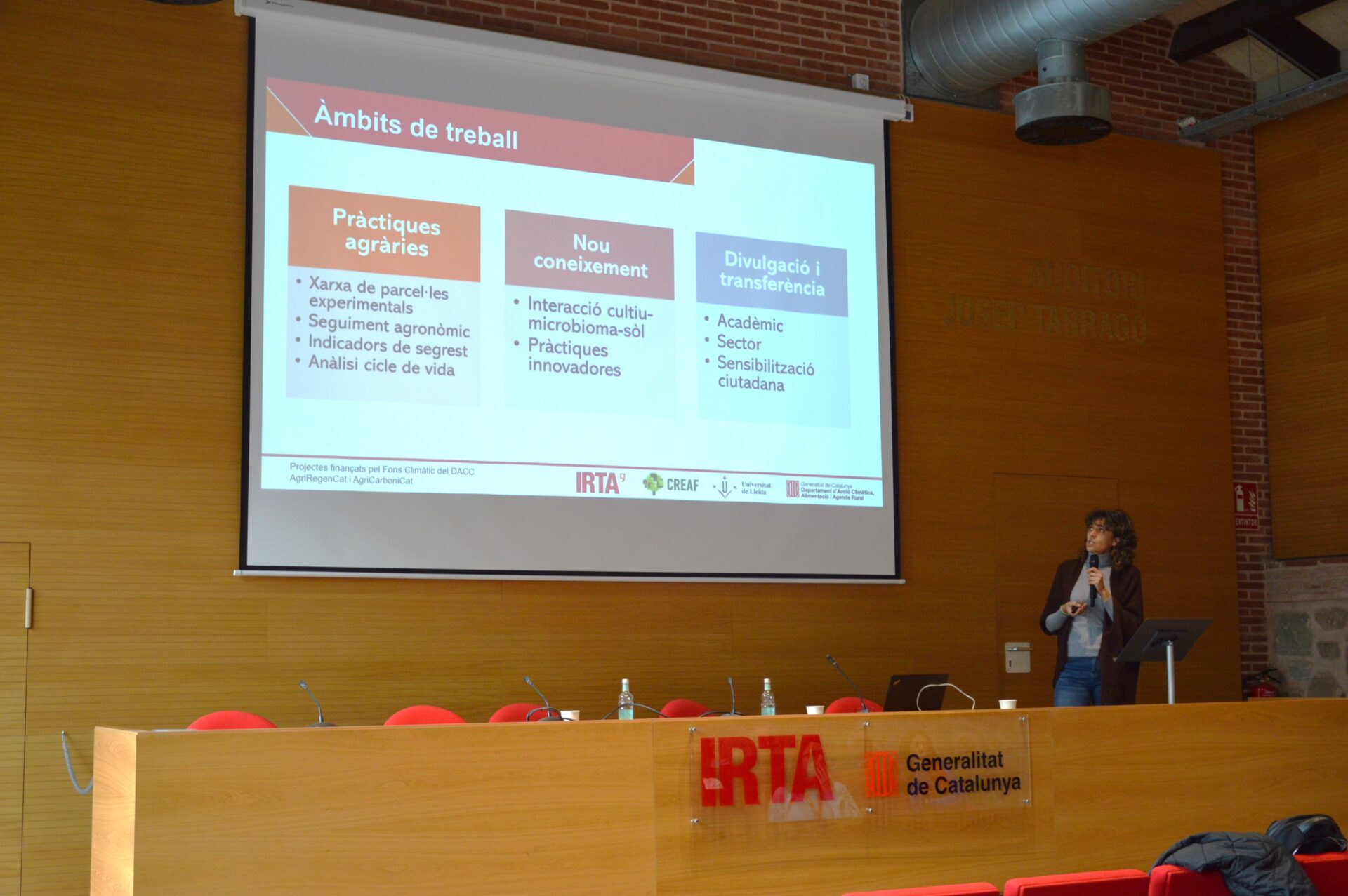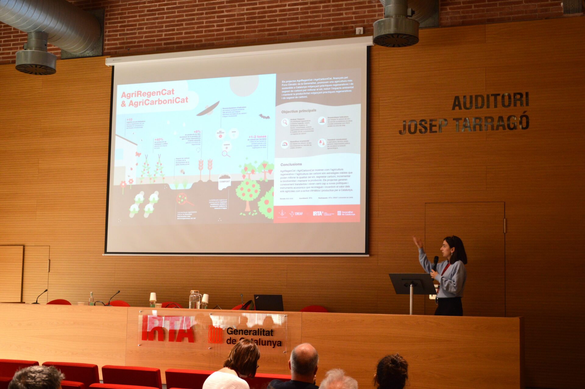 In one of the final presentations, Marc Viñas, a researcher in the IRTA’s Biosystems Sustainability programme, delved into the role of the microbiota and the rhizosphere in the productivity of agricultural soils, while Lucila Soledad González addressed the economic opportunities and possible incentive models associated with the regenerative transition, highlighting the need to align science, policy and economics to make the change of model viable.