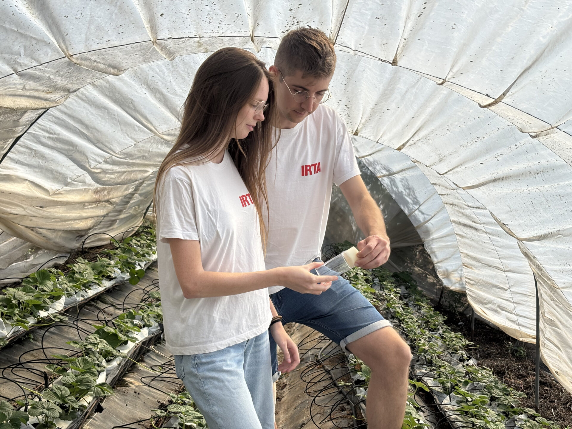 Investigadores del IRTA liberando Ganaspis kimorum en fresas