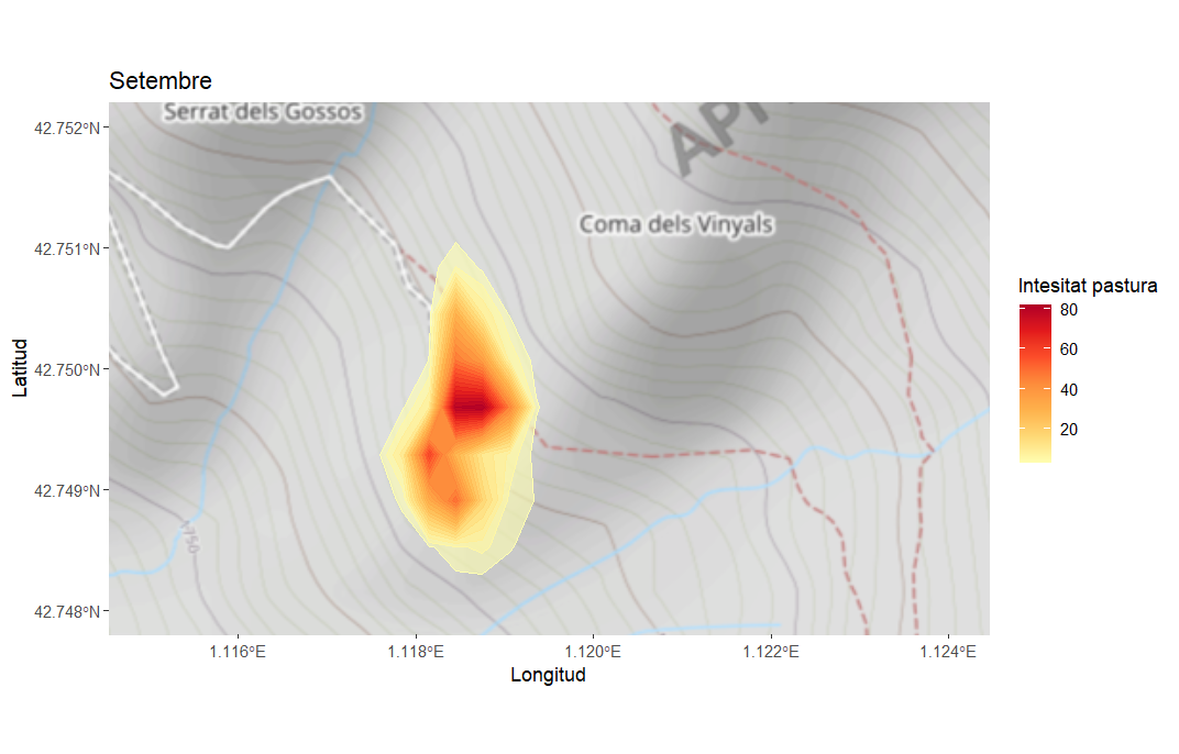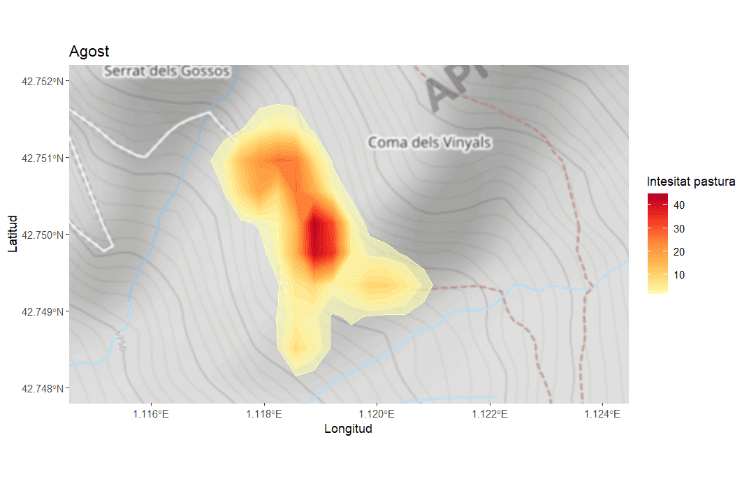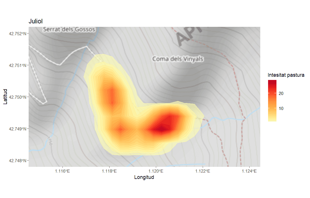 Además, los collares pueden utilizarse para la gestión territorial. Con los datos de los recorridos del rebaño se obtienen mapas de calor sobre la intensidad del pasto, que realzan las áreas preferidas por el rebaño. Cruzándolos con otras capas de información geográfica, como la distribución hídrica y vegetal, se puede evaluar la posible sobrecarga en ciertas zonas o replantear la gestión de los puntos de agua. Esta información permitiría al ganadero reorientar a los animales hacia las zonas que le interesen, reequilibrando el uso de recursos y las dietas de los animales.
