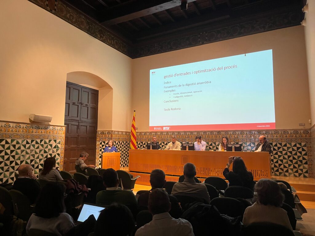 L’IRTA ha reunit una quarantena de professionals, investigadors i representants d’empreses i administracions en la 1a Jornada de Sostenibilitat del sector agroalimentari, dedicada enguany al present i futur del biogàs i la gestió dels digestats. La trobada, celebrada a l’Institut d’Estudis Catalans, ha posat de manifest que la digestió anaeròbia i la valorització dels residus orgànics són peces clau per reduir emissions, avançar cap a la neutralitat climàtica i impulsar la bioeconomia circular.