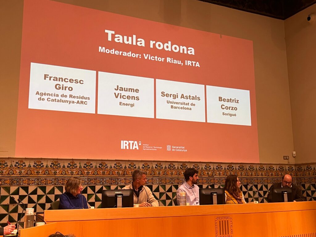 A la primera taula rodona, moderada per l’investigador de l’IRTA Víctor Riau, representants de l’Agència de Residus de Catalunya, Energi, la Universitat de Barcelona i el grup Sorigué han debatut sobre els reptes normatius i tecnològics del sector, destacant la necessitat de garantir la qualitat dels sustrats i reforçar els mecanismes de sostenibilitat i traçabilitat.