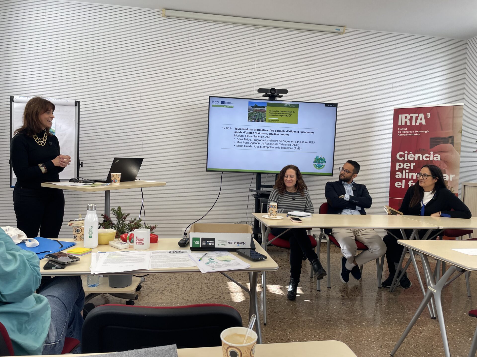 Un cop exposat el recorregut des de la recuperació fins a l’aprofitament dels materials, es va obrir una taula rodona per debatre la situació actual i els reptes normatius en l’ús agrícola d’efluents i productes derivats. La sessió, moderada per Glòria Sánchez, cap de la Secció de Qualitat i Processos de l’AMB, va comptar amb la participació d’Anas Tallou (IRTA), Meri Pous (ARC) i Maria Huerta (AMB).