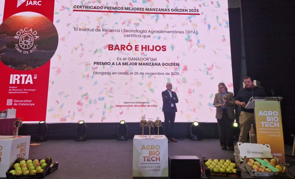 En el marc de la Fira Agrobiotech també hem participat en la 9a edició dels Premis Millors Pomes Golden 2025. Des de l’IRTA hi hem contribuït atorgant el certificat de qualitat IRTA a les pomes premiades, un reconeixement basat en criteris objectius que avaluen la coloració, la textura, el perfil sensorial i la uniformitat del fruit, que ha estat per a Baró i Fills.