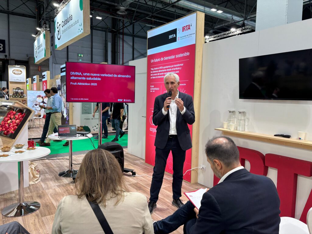 Avui hem presentat al nostre estand de Fruit Attraction 2025 la nova varietat d’ametlla DIVINA, fruit de més d’una dècada d’investigació. Es tracta d’una ametlla que combina un alt valor nutricional amb característiques agronòmiques clau, com la floració extra tardana, l’autofertilitat i una elevada productivitat, pensades per donar resposta a la creixent demanda d’aliments saludables.