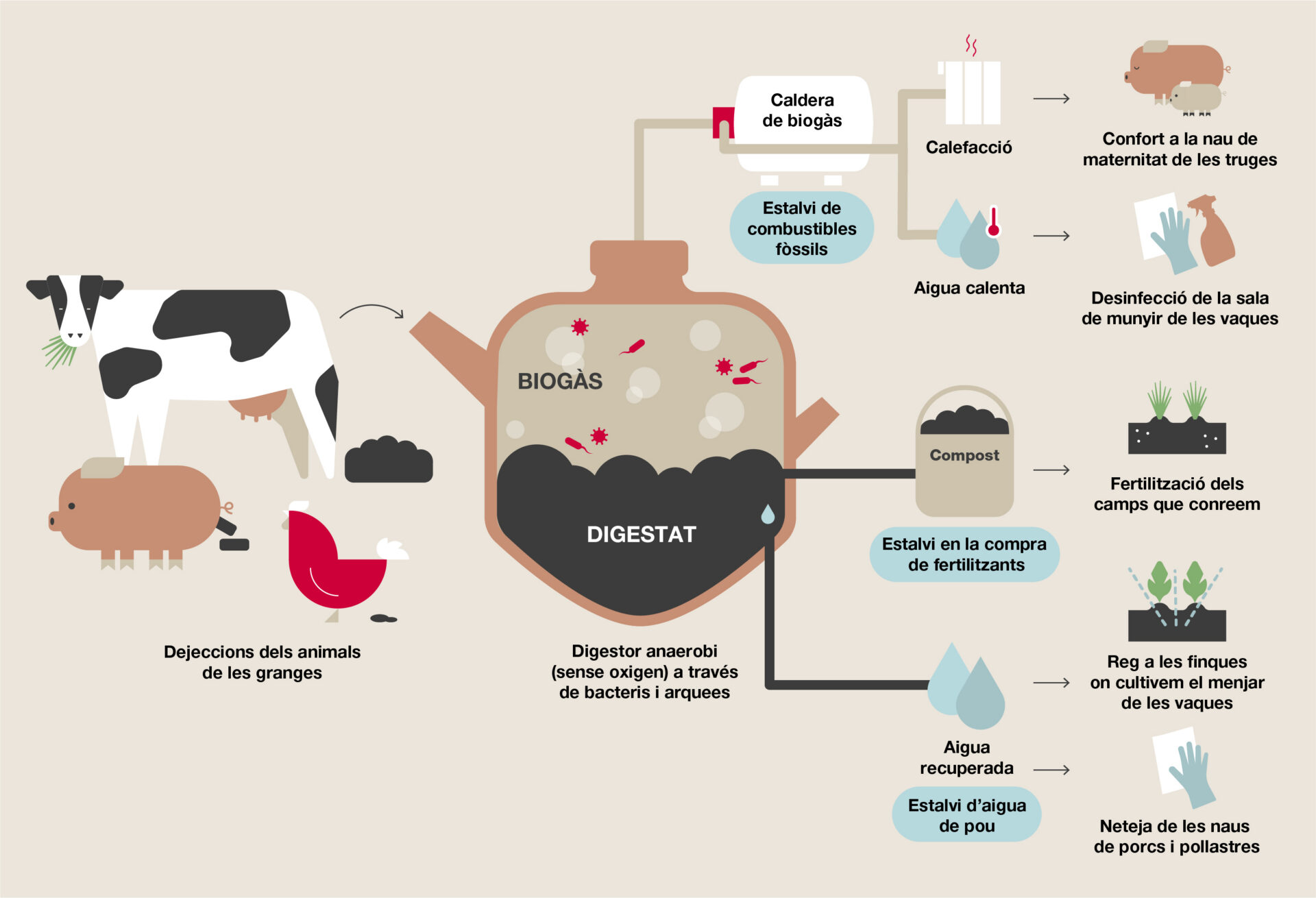 • I la part líquida esdevindrà aigua per a irrigació (als camps de Monells) i per a neteja (a les granges de Mas Bové).